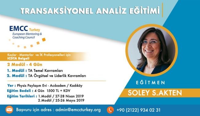“Developmental Transactional Analysis for Turkish EMCC Coaches” Transaksiyonel Analiz (TA) tüm dünyada kabul görmüş bir sosyal psikoloji alanı olup Eğitim-Psikoloji –Organizasyon alanlarında son derece kabul gören ve konu uzmanlarının (eğitmen, danışman, yönetici) ilişki yönetiminde hızlı sonuç aldıkları bir kuramdır. Transaksiyonel Analiz (TA) insanların düşünce, duygu ve davranışları hakkında anlaşılması kolay bir sosyal psikoloji teorisidir. İnsan…