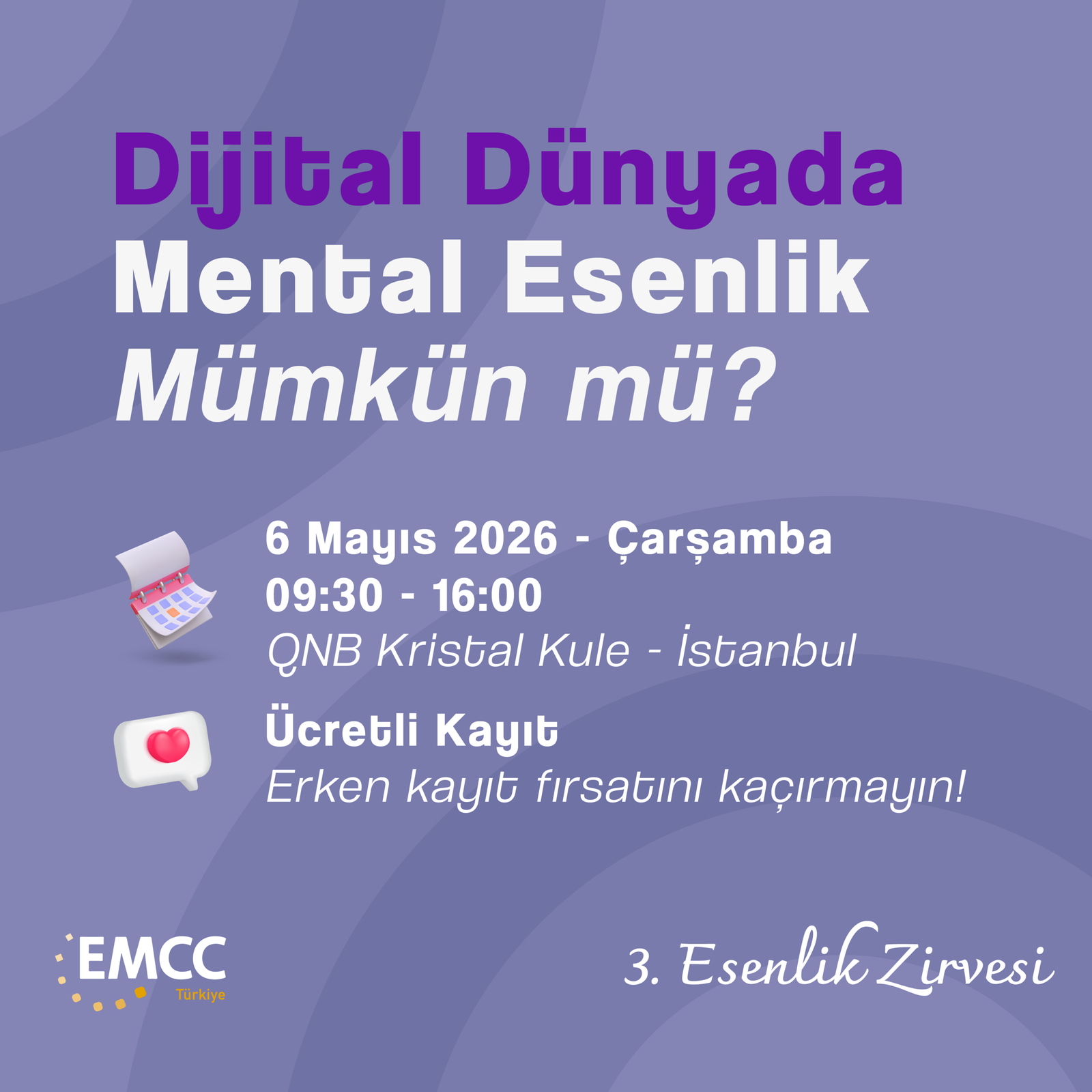 Bu yılki zirvemizde, mental olarak dengede kalabilmenin yollarını, dijital alışkanlıklarımızı yeniden dizayn etme stratejilerini ve teknolojinin insan odaklı kullanımını derinlemesine ele alacağız. Uzman konuşmacılar ve ilham verici oturumlarla, modern çağın kaosunda zihinsel berraklığı yakalamak ve esenliği sürdürmek için yeni perspektifler geliştireceğiz.