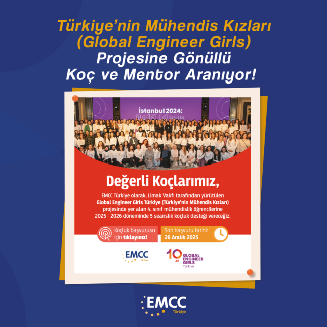 EMCC Türkiye olarak, Global Engineer Girls (TMK) Üniversite Programı’nın 2025 – 2026 döneminde, Türkiye’nin farklı illerindeki üniversitelerin mühendislik fakültelerinde okuyan, dönem sonunda mezun olacak 104 öğrencinin bulunduğu 4. sınıf öğrencisine koçluk desteği vereceğiz.